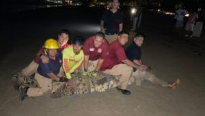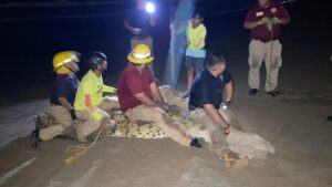 Tras mantenerlo en monitoreo permenente todo el día de ayer sábado, enorme cocodrilo fue capturado por la noche luego de que se reportara que se encontraba frente al hotel Villa Magna, en el área de playa.