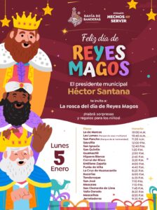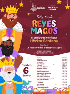 Con motivo del Día de Reyes, el H. XII Ayuntamiento de Bahía de Banderas, encabezado por el presidente municipal Héctor Santana, hace la invitación a todas las familias del municipio a participar en las partidas de rosca que se llevarán a cabo los próximos días 5 y 6 de enero en diferentes localidades.