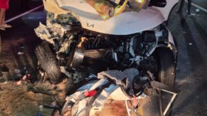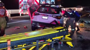 Se conoció que un vehículo marca Hyundai, tipo i10, color blanco, circulaba a exceso de velocidad en sentido hacia Tepic, cuando su conductor pierde el control y empieza a girar la unidad, impactando contra la barrera de contención y seguir hasta pegar contra una camioneta marca Kia, tipo Soneto, color blanco, quedando la pequeña unidad volcada y destrozada del frente, mientras que en la SUV, su copiloto resultó prensado.