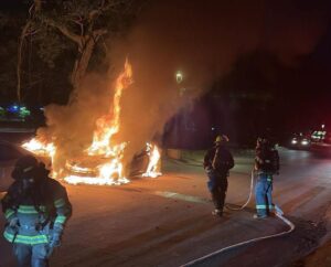 Elementos de la Dirección de Protección Civil y Bomberos de Puerto Vallarta acudieron al reporte de un incendio vehicular en la colonia Fluvial Vallarta.